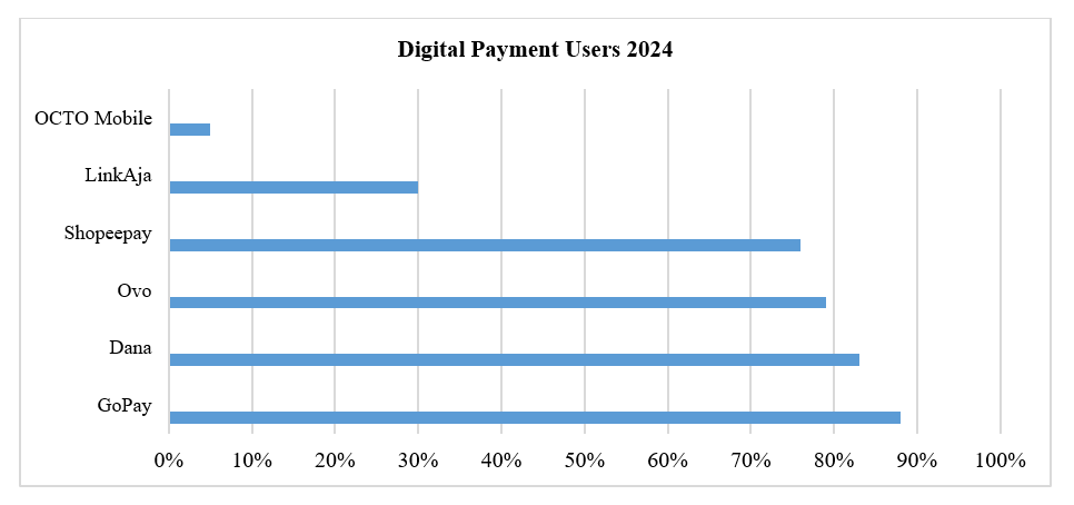 GoPay, DANA, and OVO, these three e-wallet applications are representative of the Indonesian digital payment market, which has the largest number of users and is the most popular in Indonesia. Therefore, it is not surprising that digital payment users are almost certain to download and have the GoPay, DANA, and OVO payment applications on their smartphones. From the Populix survey data above, it can be seen that the growth of GoPay users has skyrocketed compared to others in 2024. The existence of digital payments has become an attraction for the public because of the ease and convenience it offers. The existence of sharia digital payments can be a solution to reduce the cost of funds for sharia banks, so KNKS believes that the sharia banking industry in Indonesia needs and must provide this service to its customers. In addition, sharia-based digital payments are certainly also needed to accommodate the needs of the Muslim community, which accounts for 85% of the total population in Indonesia [6].
