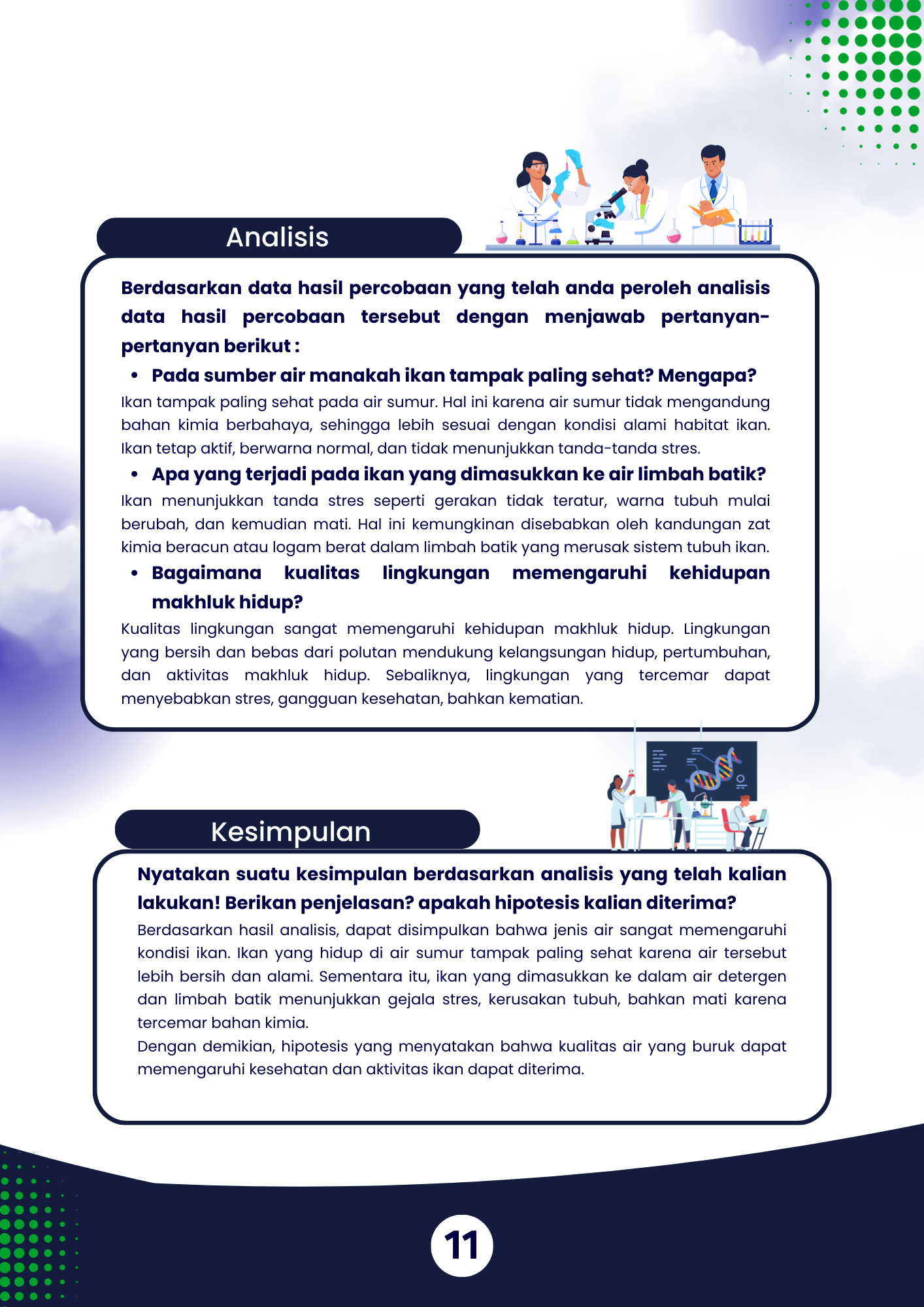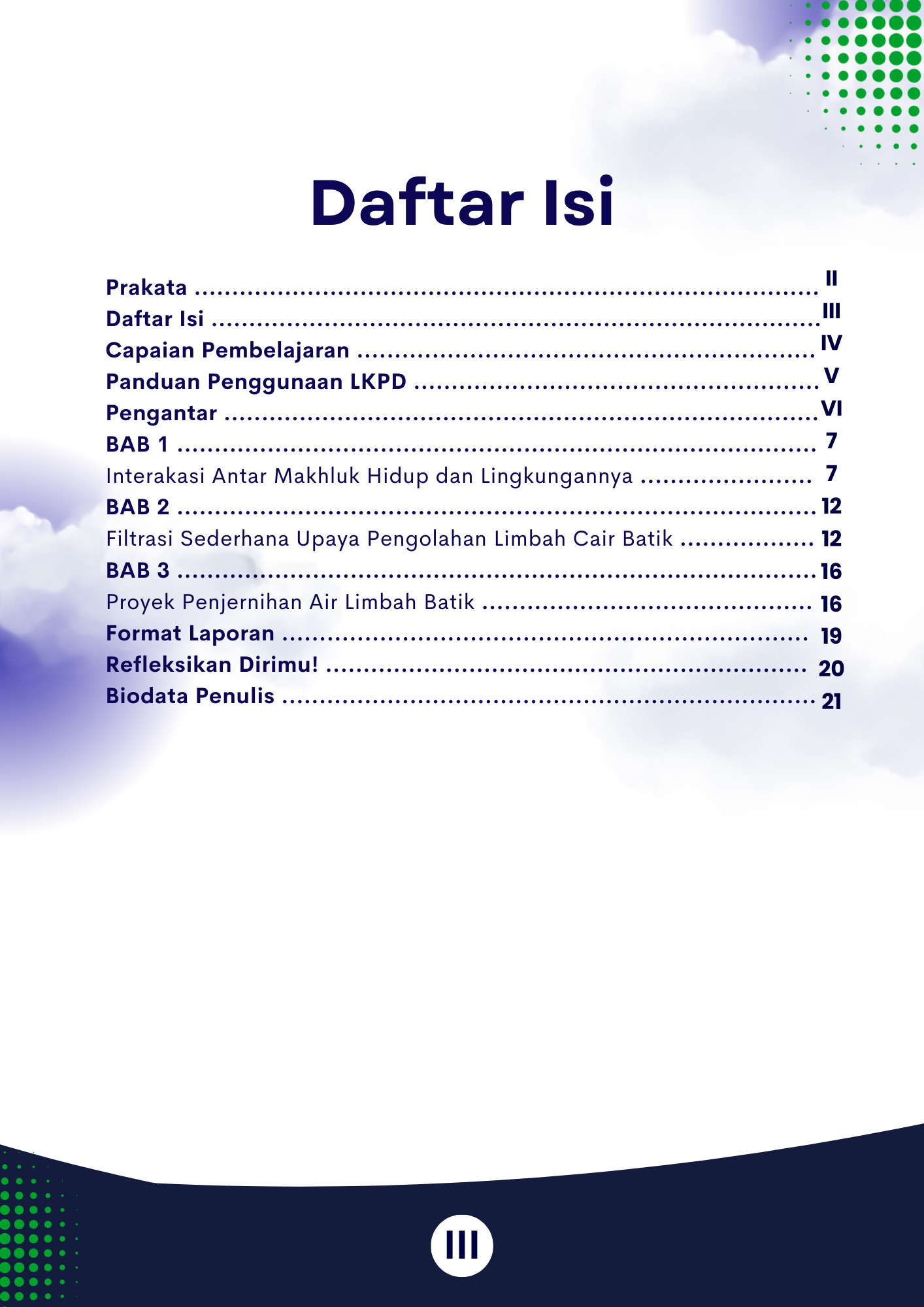 Tampilan e-book LKPD dibuat agar mudah dibaca dan nyaman bagi pengguna. Teks dan gambar yang relevan dengan materi limbah batik dimasukkan ke dalam penyajian halaman. Sementara ilustrasi digunakan untuk mendukung pemahaman materi, ukuran huruf disesuaikan agar mudah dibaca [14]. Peserta didik dapat dengan mudah mengikuti setiap tahapan kegiatan pembelajaran melalui perangkat digital karena penataan halaman dibuat dengan rapi dan konsisten.