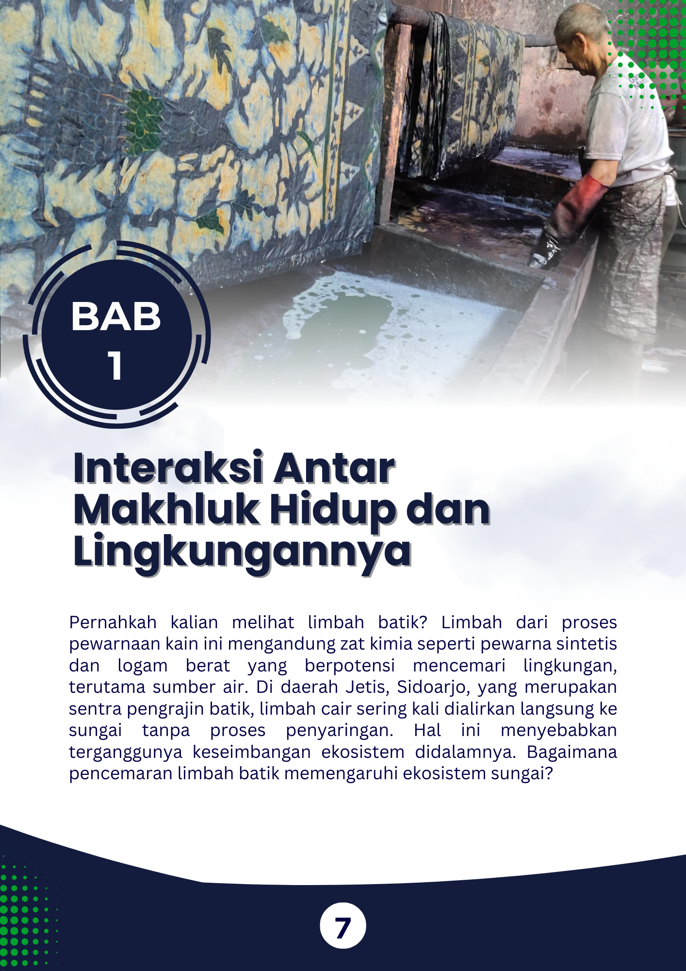 e-book LKPD berbasis SSI yang dibuat untuk produk ini menempatkan masalah limbah batik Jetis Sidoarjo sebagai konteks utama pembelajaran. Materi ini disesuaikan dengan permasalahan yang dekat dengan kehidupan peserta didik, sehingga konsep interaksi makhluk hidup dan lingkungan dapat dipahami dengan mudah oleh mereka. e-book LKPD ini berfokus pada pembahasan dampak limbah batik terhadap ekosistem perairan, serta metode filtrasi air sederhana sebagai upaya untuk pencegahan pencemaran. Melalui fitur yang telah ada, e-book LKPD ini berperan sebagai bahan ajar kontekstual yang mendukung peningkatan literasi sains dan kepedulian peserta didikterhadap lingkungan.