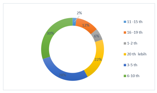 Figure 4 illustrates the distribution of work experience among the 50 respondents who participated in this study. Overall, the data show that the majority of respondents fall within the 6 to 10 years of work experience range, totaling 15 individuals or 30%. The dominance of this group indicates that the core of the research population is in a mature professional phase, where individuals have passed the initial adaptation stage and possess an in-depth technical understanding of residential building project procedures. The group with 3 to 5 years of work experience ranks second with 14 respondents (28%). Their presence represents a dynamic and operationally active workforce, capable of providing fresh perspectives on the current implementation of project management practices in the field [19]. Furthermore, a significant contribution is also provided by the senior expert group with more than 20 years of experience, comprising 11 respondents (22%). Although not the majority in terms of quantity, this group holds high strategic value because it brings extensive historical perspectives and long-standing experience in dealing with various complexities of the construction industry. Their positions, which often involve decision-making authority, add an additional layer of credibility to the responses provided in the research questionnaire. Meanwhile, respondents in the 16 to 19 years of experience category number 6 individuals (12%). This transitional group strengthens data validity by offering assessments from professionals who have long been engaged in the industry while remaining actively involved in technical supervision functions.