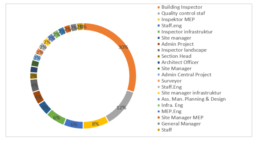 Figure 5. presents the job position profile of the respondents, showing the functional distribution within the project organizational structure. The Building Inspector position constitutes the largest group at 30% (15 individuals), followed by Quality Control Staff at 12% (6 individuals) and MEP Inspectors at 8% (4 individuals). In addition, there is representation from other managerial and technical levels, such as Engineering Staff at 6% (3 individuals), Infrastructure Inspectors at 6% (3 individuals), as well as various managerial positions including Site Manager, General Manager, and Section Head, each contributing unique perspectives. The presence of diverse positions ranging from administrative staff and surveyors to project managers indicates that the research data are inclusive and comprehensive. This ensures that the phenomenon of owner’s representative decision-making is examined from multiple viewpoints of authority and functional responsibility within the residential building project environment.