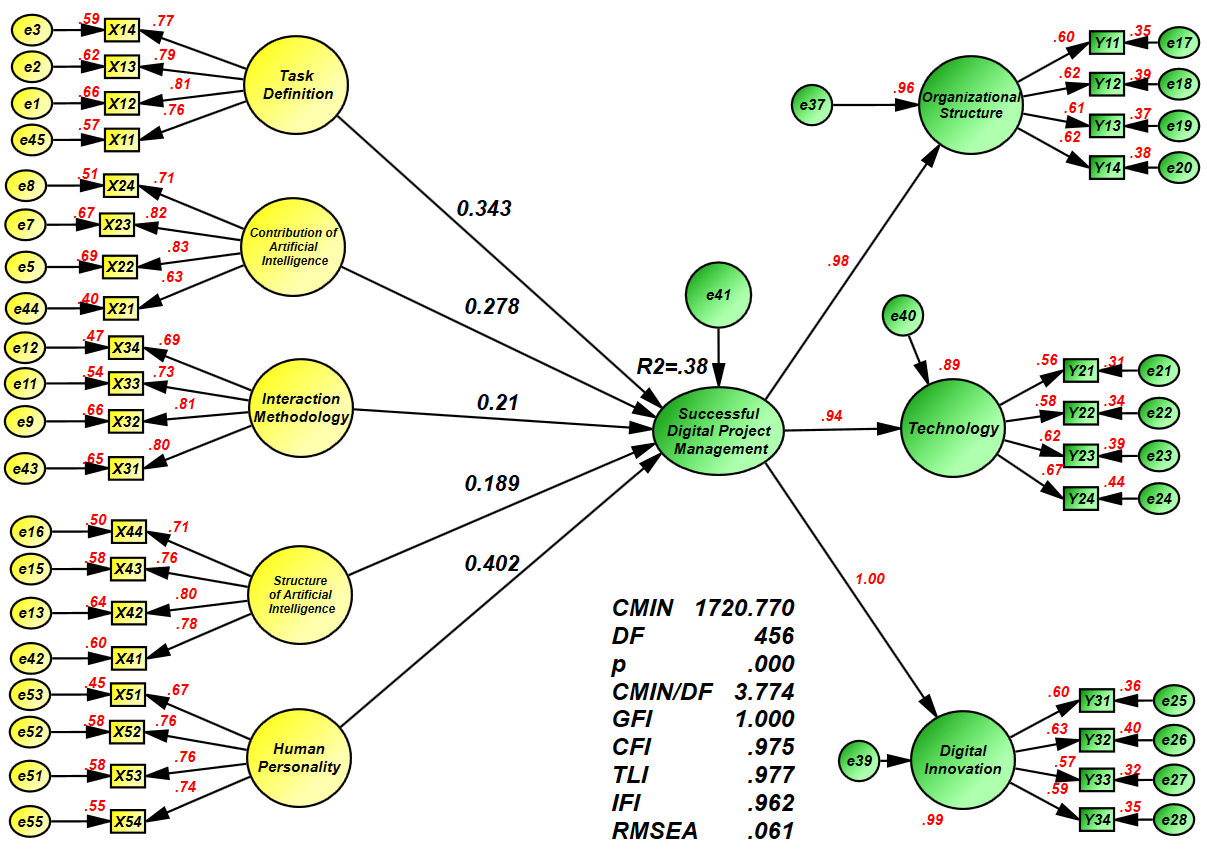 This part of the study will shift from descriptive statistics to inferential analysis, examining causal inferences among research variables. Amos was then used to perform structural equation modeling (SEM). Ver. 26 software was used to confirm the sub-hypotheses and the main hypothesis. Thus, it is designed to examine the extent to which dimensions of generative AI (task definition, AI contribution, interaction type, the form of the computer system that integrates AI [AI structure], and human personality) can predict variations in digital PM success across these dimensions. Hypotheses will be accepted or rejected based on specific statistical thresholds (such as standardized path coefficients, CR values that need to exceed the critical value, and so on), i.e., by levels of significance of effects (measured via p-value). These criteria will be listed in subsequent tables and graphs.