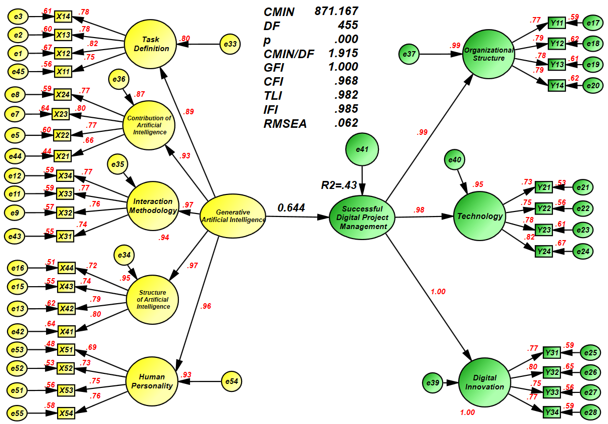 The standardized estimate (effect factor) of (0.644), which shows a one-unit rise in generative AI application interest, causing a 0.644 increase in digital project management’s success. This suggests that the better employees understand dimensions of generative AI — such as understanding tasks, drawing on intelligent systems’ contributions to achieve goals, and improvement in digital interaction patterns or creating AI architectures to be more like humans — the better the results will be for digital projects that have three dimensions: organizational structure, technology, and digital innovation. This added value emphasizes that employees’ competence and experience in generating tool use lead to the automation of difficult work, reduced risks, faster job completion, and on-time production, thereby creating additional value and competitive advantage in digital projects across the Investment Authority.