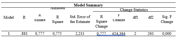 Hubungan antarvariabel dalam penelitian ini menunjukkan nilai Sig. F Change sebesar 0,00 < 0,05 menunjukkan bahwa ada hubungan signifikan secara statistik. Uji F menunjukkan bahwa variabel lokus kendali internal dan efikasi diri secara simultan memberikan kontribusi signifikan terhadap kematangan karir.