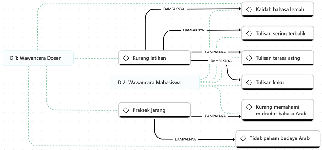 Berdasarkan hasil analisis data menggunakan software Atlas.ti, pada gambar 2 ditemukan bahwa interferensi bahasa ibu memberikan dampak yang cukup signifikan terhadap kemampuan menulis mahasiswa Program Studi Pendidikan Bahasa Arab Universitas Muhammadiyah Malang. Hal ini disebabkan oleh kecenderungan mahasiswa menerjemahkan kata per kata berdasarkan struktur bahasa Indonesia. Akibatnya, makna kalimat menjadi tidak tepat dan kurang alami dalam konteks bahasa Arab.