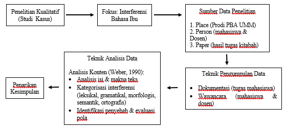 Pada gambar 1, alur penelitian ini menggambarkan proses kajian yang menggunakan pendekatan kualitatif jenis studi kasus dan fokus pada interferensi bahasa ibu pada keterampilan menulis bahasa Arab mahasiswa. Penelitian ini dilakukan di Program Studi Pendidikan Bahasa Arab, Universitas Muhammadiyah Malang, menggunakan tiga sumber data utama yaitu place (latar akademik PBA UMM), person (mahasiswa dan dosen) dan paper (hasil tugas kitabah mahasiswa). Data yang didapatkan melalui tulisan mahasiswa dan wawancara dosen dianalisis untuk mengetahui bentuk dan dampak interferensi. Dalam penelitian ini analisis konten teori dari Weber (1990) digunakan dalam menganalisis bentuk interferensi bahasa ibu yaitu leksikal, gramatikal, morfologis, semantik, dan ortografis. Hasil dari analisis konten tersebut akan dijelaskan secara rinci untuk menarik kesimpulan mengenai interferensi bahasa ibu terhadap kemampuan menulis mahasiswa pendidikan bahasa Arab Universitas Muhammadiyah Malang.