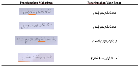 Mahasiswa I menuliskan (عاد إلى المنزل من المستشفى),mahasiswa II menuliskan (يرجع الطبيب من المستشفى), dan mahasiswa III menuliskan(رجعت ذلك الطبيب من المستشفى) .Sedangkan untuk jawaban yang benar adalah(رجعت الأطباء من المستشفى).
