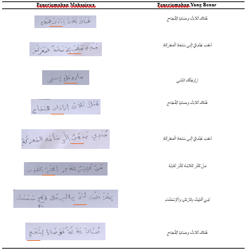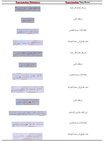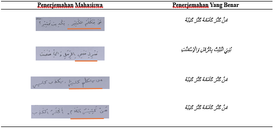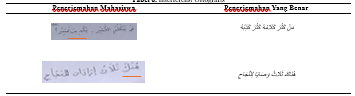 Pada Tabel 6, interferensi ortografis (penulisan huruf/harakat) mahasiswa terdapat pada kata "يكذيب" tampaknya hasil terjemahan yang salah dari "berbohong", pengaruh fonetik dari bahasa Indonesia. Kata yang ditulis "هنك" seharusnya هناك (ada).