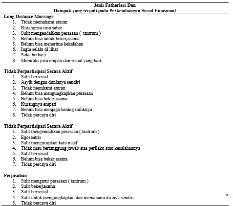 Anak-anak yang tidak memiliki figur ayah yang kuat dapat menghadapi kesulitan dalam membangun rasa percaya diri, mengontrol emosi, dan membangun hubungan sosial yang positif [14].Anak memiliki kemampuan akademis yang rendah, sulit menentukan keputusanSelain itu, mereka berisiko mengalami masalah fisik dan psikologis, seperti diskriminasi dan perundungan, serta pengucilan dari lingkungan mereka [15]. Sehingga mengakibatkan perkembangan sosial emosionalnya sedikit terlambat dari teman sebaya.