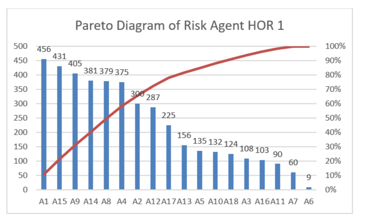According to Grosfeld-Nir, Ronen, & Kozlovsky (2016), a good Pareto chart is one in which about 20% of the attribute components carry 80% of the weight. It can thus be concluded that 80% of the risk of loss is caused by 20% of these essential factors.[13] By prioritizing the 20% risk factors, the impact of the 80% risk can be managed and mitigated early. In this study, a Pareto diagram is used to identify the main risk agents that will become a priority in the management and mitigation of risks. The formulation of risk management, handling, and mitigation efforts as a form of preventive action will be carried out in the HOR Phase 2 stage.