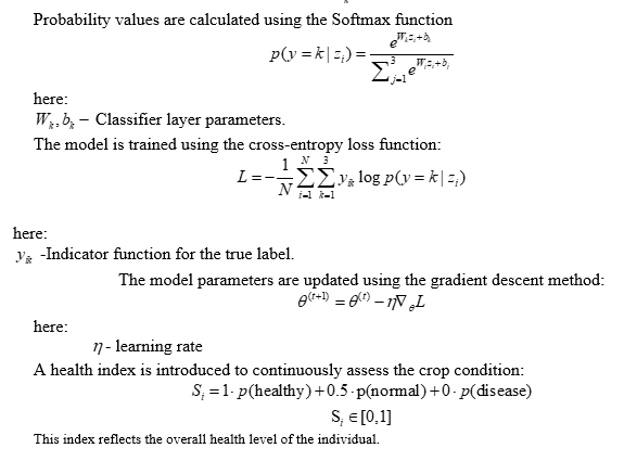 The output component of the model consists of a classification and evaluation block that categorizes crop conditions into healthy, normal, or diseased classes. The results are presented either as probabilities or as a final decision, enabling fast and informed decision-making during the monitoring process.