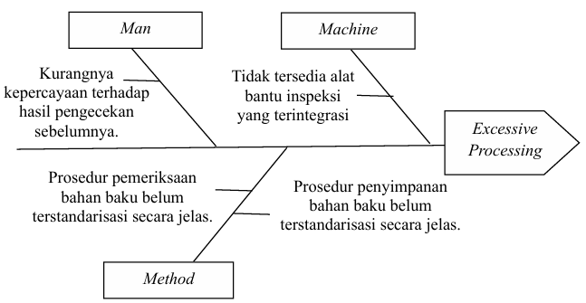 Pengaturan tenaga kerja dalam aktivitas pemindahan material belum optimal, belum terdapat metode standar dalam penentuan jalur dan urutan pemindahan bahan baku, layout gudang belum dirancang untuk meminimalkan jarak perpindahan material, serta keterbatasan jumlah forklift sehingga pemindahan bahan baku dilakukan secara bertahap serta mengakibatkan proses transportasi bahan baku tidak dapat dilakukan secara simultan (bersamaan). Sehingga menyebabkan pemborosan transportasi. Selanjutnya terdapat pemborosan proses berlebihan yang dapat dilihat pada gambar 6.