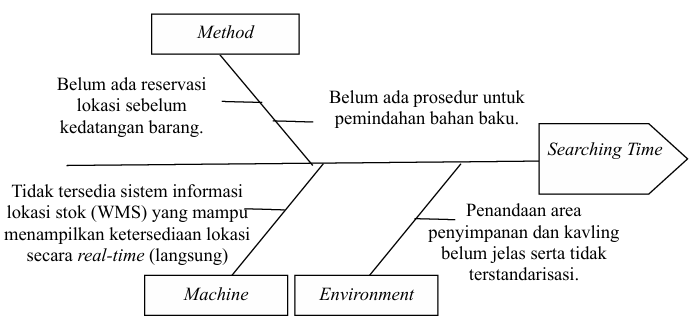 Belum terdapat prosedur pemindahan bahan baku dan reservasi lokasi penyimpanan sebelum kedatangan barang, tidak tersedia sistem informasi lokasi stok (WMS) yang mampu menampilkan ketersediaan lokasi secara real-time (langsung), dan penandaan area penyimpanan dan kavling belum jelas serta tidak terstandarisasi. Sehingga menyebabkan pemborosan waktu pencarian. Selanjutnya terdapat diagram tulang ikan untuk pemborosan pergerakan tidak perlu yang dapat dilihat pada gambar 4.