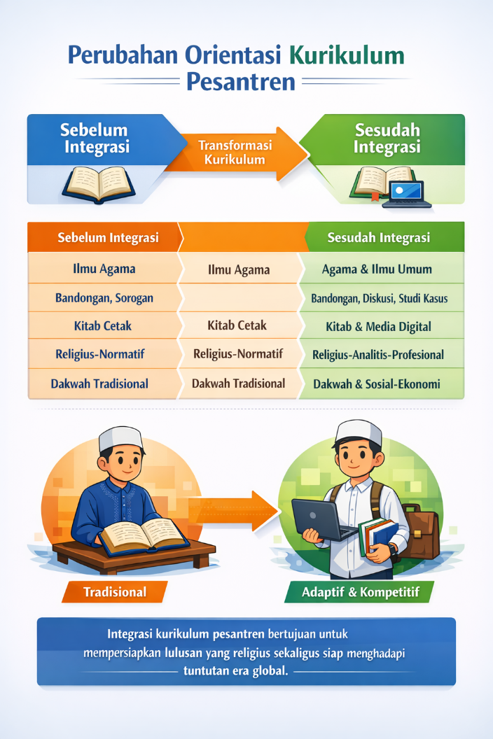 As external demands and community expectations regarding the relevance of pesantren graduates amid global competition increased, pesantren underwent curriculum transformation through the integration of general knowledge. This transformation is reflected in the enrichment of learning methods based on analytical discussions and case studies, the use of digital media, and the expansion of graduate competency orientation towards religious, analytical, and professional aspects. This visual emphasizes that curriculum integration is not merely an academic innovation, but an institutional strategy to ensure that santri have social, economic, and professional competitiveness, while maintaining their Islamic scholarly identity.