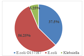 The diagnostic result showed the growth of 30 E. coli O157:H7 isolates due to their resistance to this antibiotic, while the remaining isolates gave a negative result. E. coli grew on CHROMagar as intense blue colonies, unlike the O157 strain, which grew as purple colonies, as shown in Figure 3 (a,b) below. Some bacterial species were identified visually based on their cultural characteristics. Some isolates appeared on Sorbitol MacConkey Agar (SMAC) medium (Figure 2), with no colonies of E. coliO157:H7 on the culture media containing the isolates identified using cultural characteristics. The characteristics of E. coli O157:H7 were small and pale yellow in color due to their inability to ferment and consume sorbitol, and their number was 30 isolates. For other E. coli isolates, the colonies were pink, and the results showed that the number of E. coli isolates diagnosed in this medium was 5 isolates. The results also showed the presence of Klebsiella bacteria (4isolates), which were diagnosed in this medium.