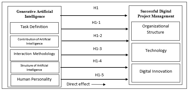 • Human personality hypothesis: The output demonstrated support for the human personality Hypothesis; it has the highest standardized value (0.402) and a significance level of 0.009, indicating that this dimension is more efficient for digital project management success. This supports the theoretical view of the central importance of human action, skill , and experience in simulating and being creative with generative machine intelligence. They are the ones with the qualifications needed to bridge digital gaps, thereby directly improving administrative procedures and processes that help address uncertainties in digital projects.