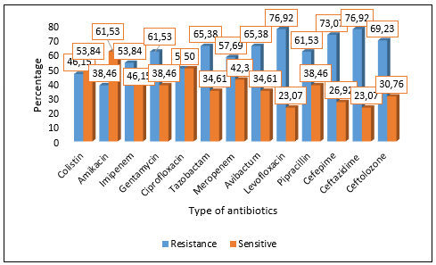 Figure 2. Figure (2): Resistance and sensitivity patterns rates to antibiotics in P. aeruginosa