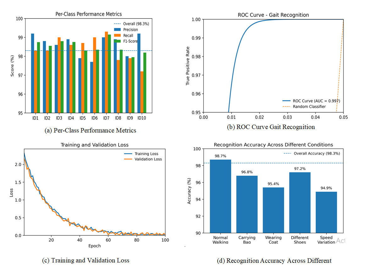 Figure 7. All-inclusive evaluation of classifier performance, including: (a) class accuracy, recall, and F1 score for 10 sample identities, showing balanced performance across all metrics; (b) the ROC curve, showing near-perfect discrimination with an AUC of 0.997; (c) the training and validation loss curves, showing smooth convergence without over-allocation; and (d) recognition accuracy across various walking conditions, showing the model's resilience against different factors. Detailed Analysis of Subplots: