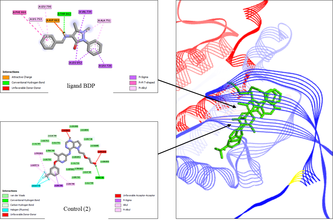 Figure 4. Fig. 4.Two-dimensional interaction diagrams of ligand BDPand control (2) with the target breast cancer virus 3pp0.
