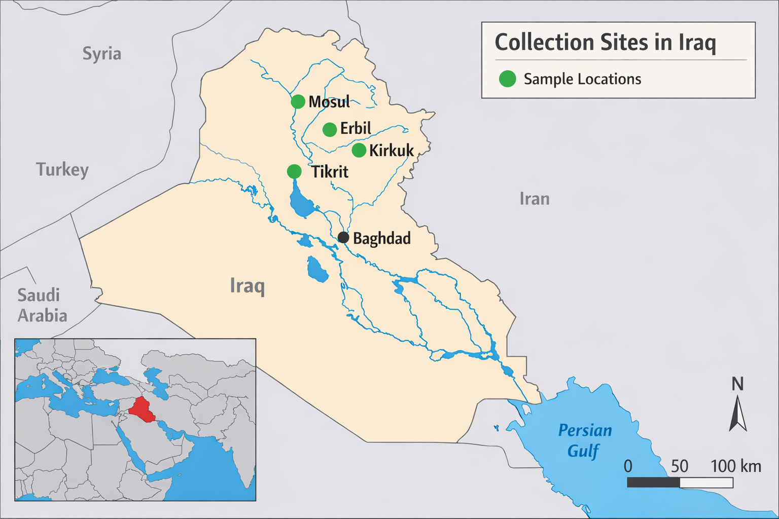 The DNA was extracted from small fresh leaves of the Brassica species under study, obtained from trips in the center and north of Iraq as Erbil, Sulaimani, Kirkuk, Mousl, and Salahaldin Figure 1, using Cetyltrimethylammonium bromide (CTAB) and the method according to [10], based on the principles laid down by [11]. The protocol of genomic DNA was followed during the extraction procedure [12].