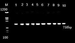 The results of the current study showed that most of the samples gave bands after being subjected to electrophoresis. These bands were characterized by their clarity and density. These bands were 758 base pairs after comparing them with the DNA Ladder. Because it provides a clear image of the strength of the relationship between several clans of the same origin, the appearance of bands with almost identical molecular sizes shows that they have the same genetic basis, according to [18]. The use of these specialized genes contributed to clarifying the correlation, Figure 3.