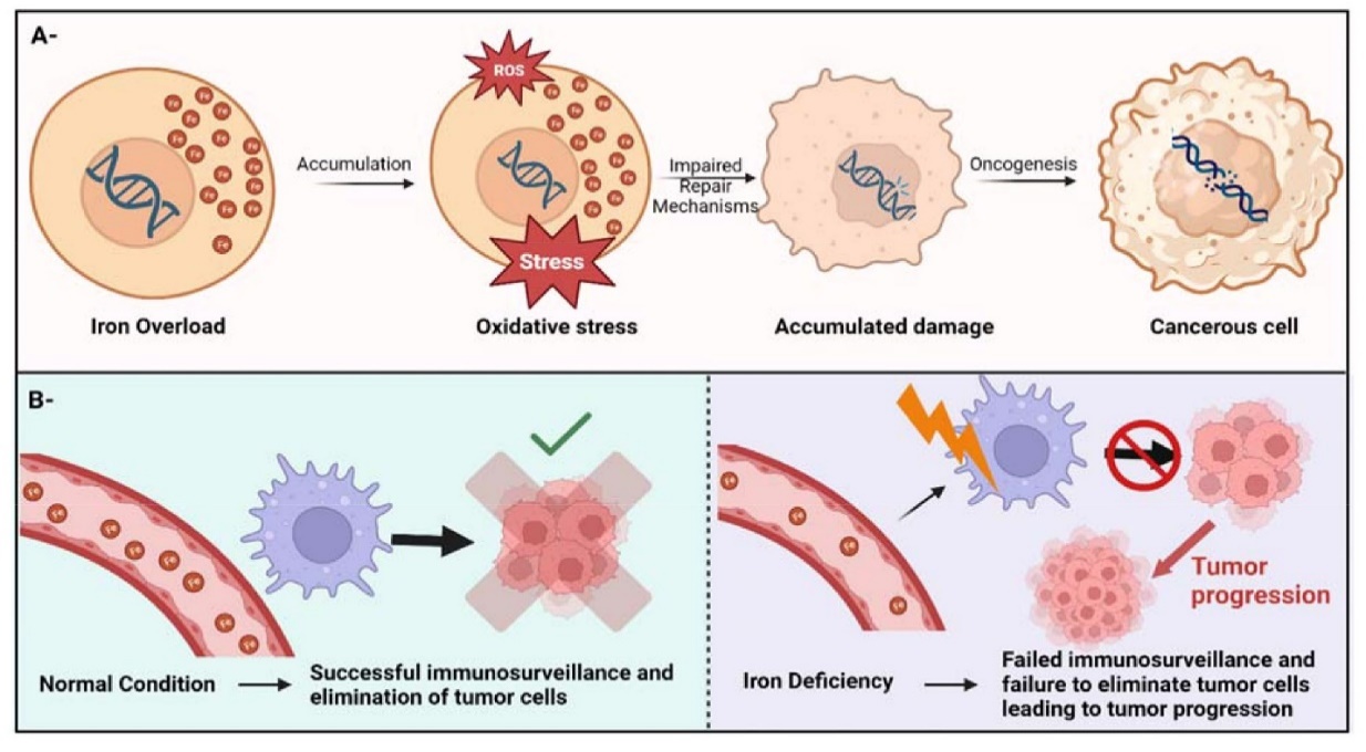 On the other hand, iron deficiency has been increasingly recognized as a factor that may contribute to cancer growth. This is because iron is important for the immune system to work properly. Immune cells, like T cells and natural killer (NK) cells, need enough iron to function well. These cells play a crucial role in identifying and eliminating cancer cells. When there's not enough iron, these cells don't work as well. They produce fewer signaling proteins called cytokines, are less effective at killing cancer cells, and have a reduced ability to present cancer cells to other immune components. This weakens the body's ability to spot and destroy tumors. This makes it easier for cancer to start and spread. Also, long-term iron deficiency can cause ongoing inflammation, which can lead to more DNA damage and help cancer cells grow [43].