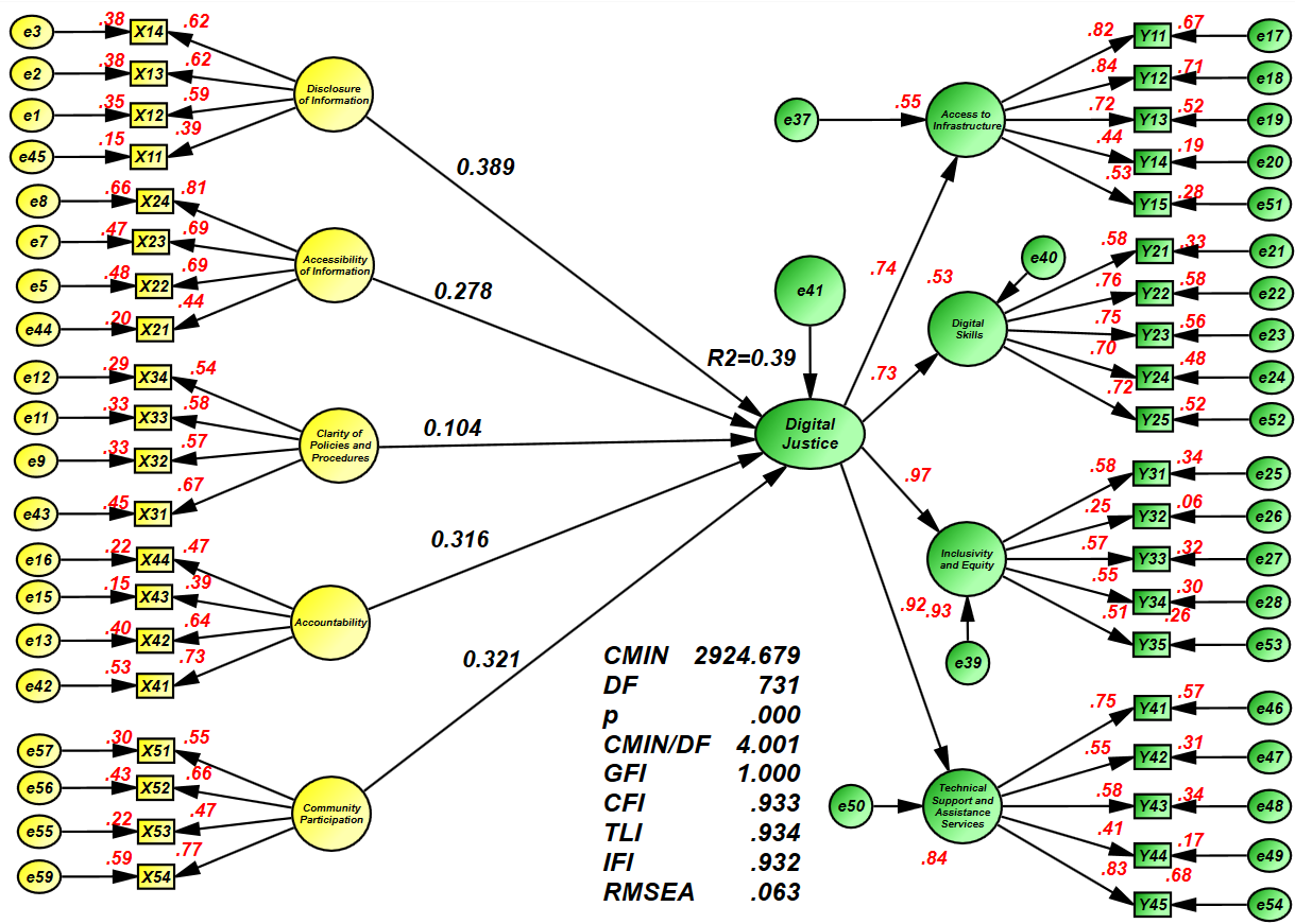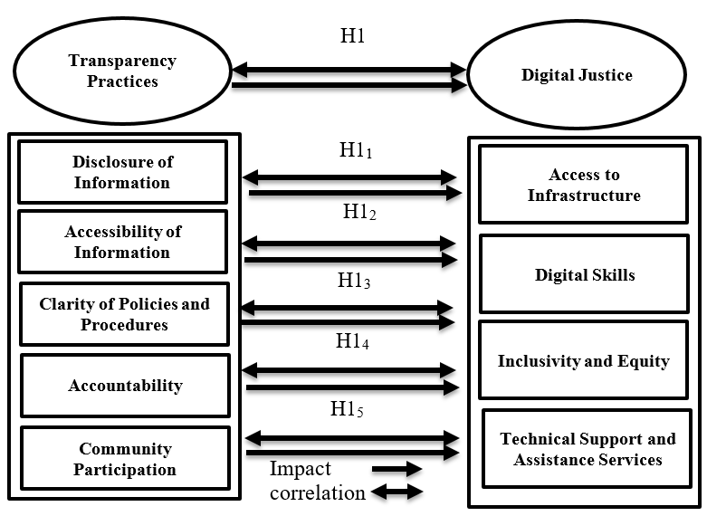 The analytical findings indicate a substantial and affirmative influence of each dimension of transparency practices (information disclosure, information accessibility, clarity of rules and processes, accountability, and community engagement) on digital justice in the examined library.