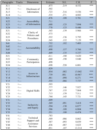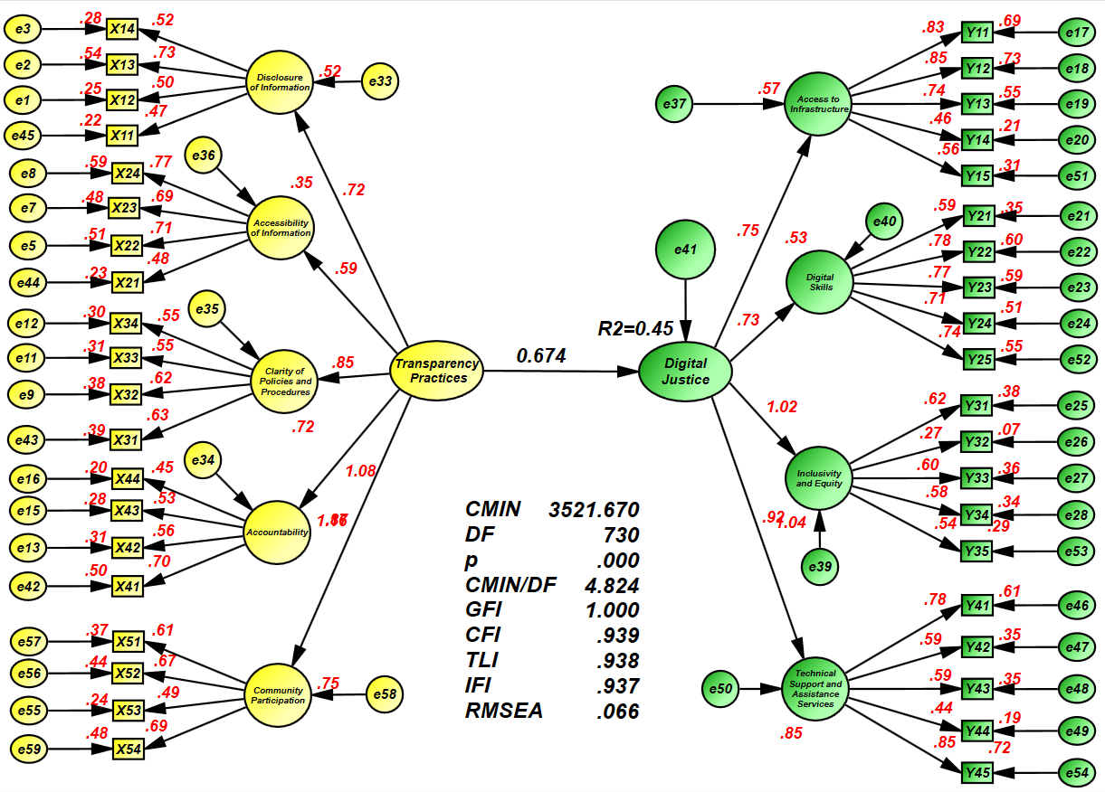 Based on the statistical analysis, it is clear that transparency practices have a significant and positive impact on digital justice. According to the Table, the standard regression weights (impact parameter) were (0.674), indicating that every one-unit increase in transparency practices leads to a 0.674 unit increase in digital justice.