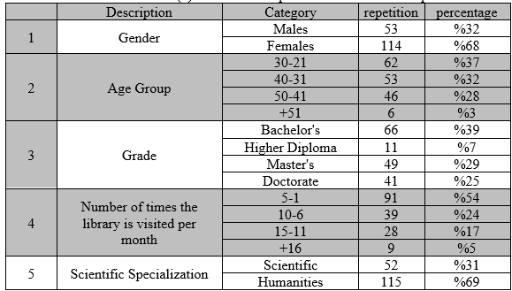 Table 3, which describes the research sample by gender, indicates that females comprise the highest percentage (68%). The sample description by age group indicates that the (21-30) and (31-40) age groups each achieved 69%. This may be because the largest number of sample members were fourth-year students. The lowest percentage (3%) was for those over 51 years old. The sample description by grade level indicates that the highest percentage was for fourth-year students. The sample description, by the number of times the library was visited, was for the (1-5) category, which had the highest percentage (54%), while the lowest percentage was for the (16+) category. Finally, the sample description by specialization reveals that the highest percentage (69%) was for humanities majors.