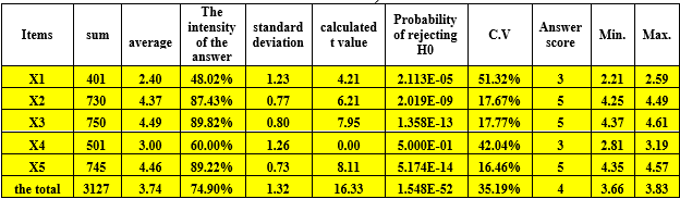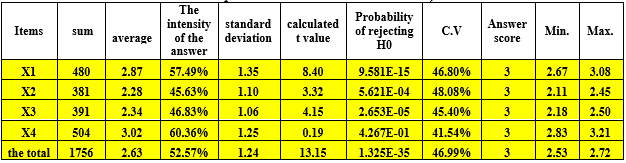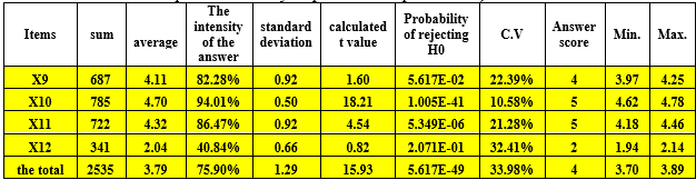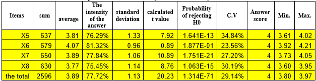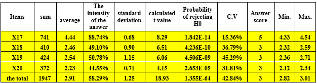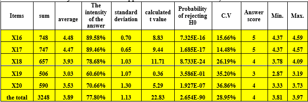 Table 8 reveals that the highest arithmetic mean (4.44) corresponds to question 17, suggesting that the library engaged beneficiaries in ongoing surveys to ascertain their opinions regarding the services and resources offered, aimed at enhancing the quality of information services. The lowest arithmetic mean (2.23) was recorded for question (20), indicating a lack of widespread invitations from the library to beneficiaries to attend meetings and activities aimed at enhancing its services.