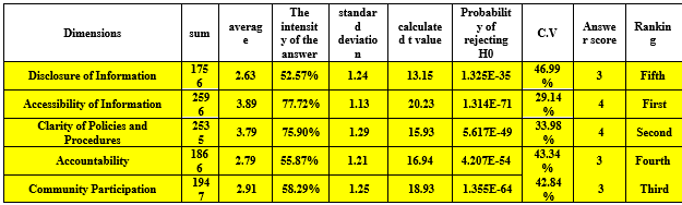 The data presented in Table 9 concerning the hierarchy of the dimensions of the transparency practices variable reveal that the dimension of access to information ranks first with a total response intensity of 77.7%. This is followed by the dimension of clarity of policies and procedures, with a response intensity of 75.9%. The dimension of community participation follows with a response intensity of 58%. Lastly, the dimensions of accountability and information disclosure exhibit response intensities of 55.8% and 52.5%, respectively.