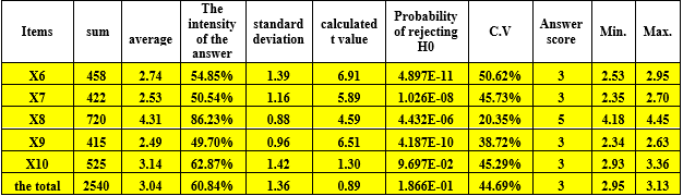The data in Table 10, analyzing responses to the dimension of access to infrastructure, reveal that the highest arithmetic mean (4.49) corresponds to the third question, indicating that the library offers appropriate spaces for electronic work, such as private retreats equipped with power outlets and internet connections. This is followed by the fifth question, which has an arithmetic mean of (4.46), indicating that the library allows beneficiaries to access digital resources remotely, irrespective of their location. The lowest arithmetic mean (2.40) was recorded for the first question, indicating the inadequate capacity and speed of the library's internet connections in providing beneficial services.