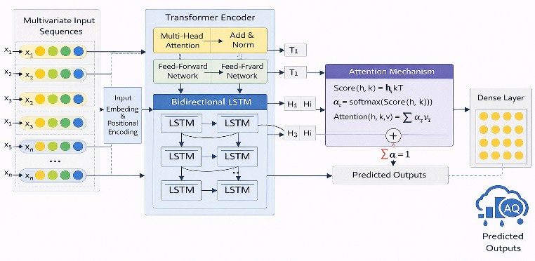 The proposed approach uses a hybrid deep learning architecture that combines the best features of the Transformer encoder, a bidirectional long-term memory network (BiLSTM), and an attention mechanism to improve multivariable air quality prediction. The proposed approach uses a hybrid deep learning architecture that combines the best features of the Transformer encoder, a bidirectional long-term memory network (BiLSTM), and an attention mechanism to improve multivariable air quality prediction. Every element has a distinct purpose in gathering various facets of time-series data. The architecture of the suggested hybrid model is shown in Figure 1. To acquire high-level representations of the input sequences, the Transformer encoder initially employs a self-attention technique [28]. Long-range dependencies and general correlations between various air quality indicators are well captured by this component of the model. This model aids in comprehending how intricate relationships evolve over time.The BiLSTM layer receives the gathered characteristics and processes the sequence in both directions. This improves the model's capacity to simulate how pollutant concentrations fluctuate over time by allowing it to simultaneously learn past and future patterns [29]. The model can selectively focus on significant temporal aspects thanks to the attention mechanism, which permits a dynamic distribution of weights on hidden states. In multivariable air quality forecasting tasks, this improves the model's prediction performance by strengthening its capacity to learn long-term dependencies [30].