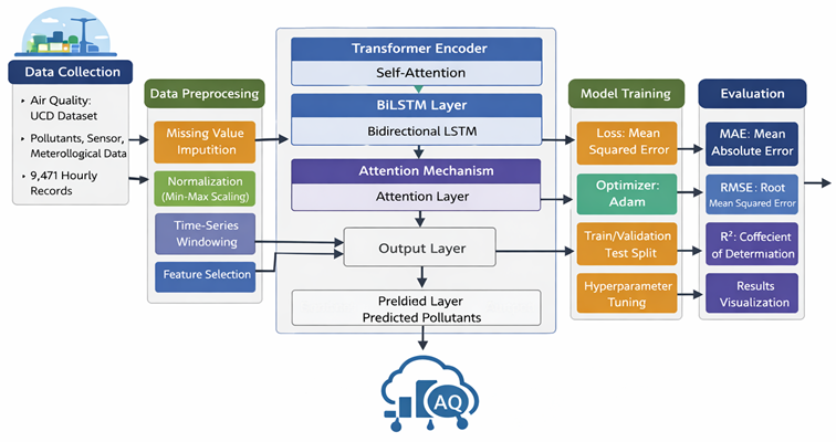 Building on these developments, this study presents a hybrid model combining Transformer, BiLSTM, and Attention for accurate multivariate air quality prediction. The proposed design leverages the properties of contrasting modeling approaches; the Transformer encoder captures interactions between features and long-term temporal dependencies. By processing data in both forward and bidirectional, the BiLSTM component enhances sequential learning. The Attention mechanism dynamically identifies the most relevant temporal patterns for prediction. This approach is well-suited for complex environmental datasets with multiple components that vary over time .The Air Quality UCI dataset, which consists of real hourly data gathered from a network of chemical sensors set up in an urban area together with meteorological variables, is used to assess the suggested model. Advanced forecasting models can be tested well with the dataset since it reveals real-world monitoring scenarios like missing values and multivariate coupling. Below are the main points of this study's contributions: