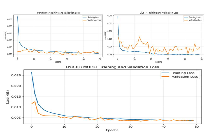The training and validation loss for three models as illustrated in Figure 5. The training and validation loss curves show a smooth and consistent convergence throughout the training period. The convergence of these curves indicates that the model is well-optimized and does not suffer from over-allocation. This behavior demonstrates the ability of the proposed hybrid architecture to generate useful representations that efficiently match current data, compared to baseline models.