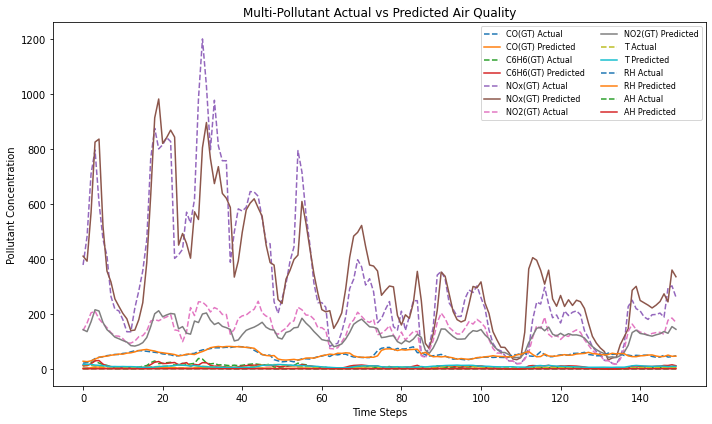 Figure 9. Figure 6. Actual and predicted values of multiple air quality parameters across time