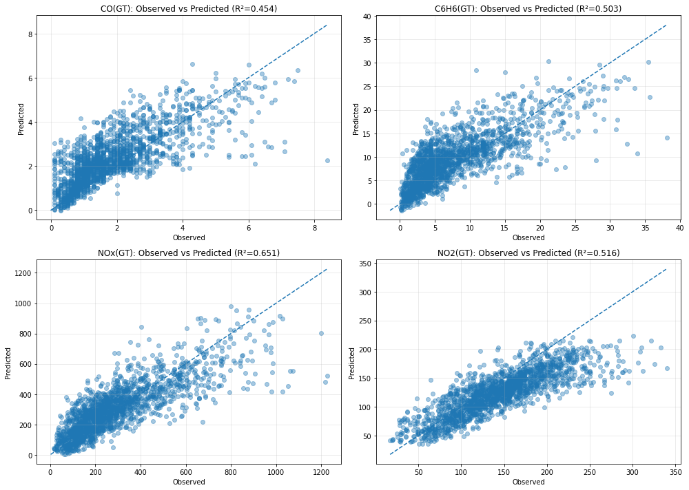 The dispersion plots for the actual and expected concentrations of carbon monoxide (CO), ethane (C6H6), nitrogen oxides (NOx), and nitrogen dioxide (NO2) are displayed in Figure 7.All of the contaminants have strong linear connections, as these charts show. The majority of sites are situated near the diagonal reference line, suggesting that there is little systematic bias and that the forecasts are very consistent. These findings are supported by the coefficients of determination (R²). The explanatory power of all pollutants ranged from moderate to strong, with nitrogen oxides (NOx) having the highest R2 value. The greater dispersion observed at high concentration levels is due to the intrinsic variability in the occurrence of large pollutants, rather than to limitations in model stability.