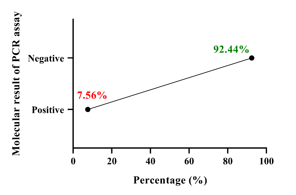 The findings of molecular PCR recorded that the incidence rates of human T. vaginalis in women of Wasit province were 7.56%. In comparison to other local studies, the occurrence of human trichomoniasis was 38.1% in Al-Anbar using the microscopic examination of vaginal swab (Al-Ani et al., 2001), 1.66% in Sulaimania by direct microscopic examination and culture (Fattah and Kadir, 2010), 5.23% in Thi-Qar by wet method (Al-Abady and Al-Khazrajee, 2014), 8.33-21.67 % in Wasit by wet mount microscopy, Whif test, and RT-PCR (Rahi et al., 2014a,b), 12.41% in Diyala by wet mount examination (Hussein and Shaker, 2017), 62% in Tikrit by direct wet mount and liquid cultivate (Al-Ammash, 2017), 27.90% in Al-Najaf by wet mount examination (Al-Abbas and Radhi, 2019), 26-32% in Al-Muthana by wet smear and PCR (Al-Abodi et al., 2019), 2.73-3.18% in Erbil by direct wet method and culture respectively (Nouraddin and Alsakee, 2019), 28.10% in Kirkuk by microscopic examination of endocervical and vaginal swabs as well as urine (Salman et al., 2019), 26.27% in Babylon by wet mount (Al-Kahfaji and Seher, 2020), 75.22% in Maysan by microscopic examination and cultivation (Al-Majidii and Alsaady, 2020), 25.5% and 29.5% in Al-Qadisiyah by wet smear and RT-PCR, respectively (AL-Khalidy and Al-abodi, 2020), 8.7-40.35% by microscopic examination of vaginal swabs and urine as well as indirect ELISA (Bedair and Ali, 2020), 0.5-1.6% in Basra by direct microscopic examination of vaginal swabs and urine (Kadhum et al., 2020), 5.5-8.62% in Karbala by wet mount, gram staining and PCR (Alhusseini and Alquraishi, 2021), 3.3% in Mosul by wet mount (AL-TAEI, 2022), 5.5% in Baghdad by PCR (Ghaima, 2022), and 9% in Duhok by microscopically wet mount examination (Murad et al., 2024). However, variations between the findings of the current study and the above mentioned studies could be attributed differences in diagnostic methods, study population (socio-demographic factors), geographical location, screening practices, sample size and type, and the presence of various T. vaginalis strains or other bacterial or viral infections that could interfere with the examination and interpretation of results.