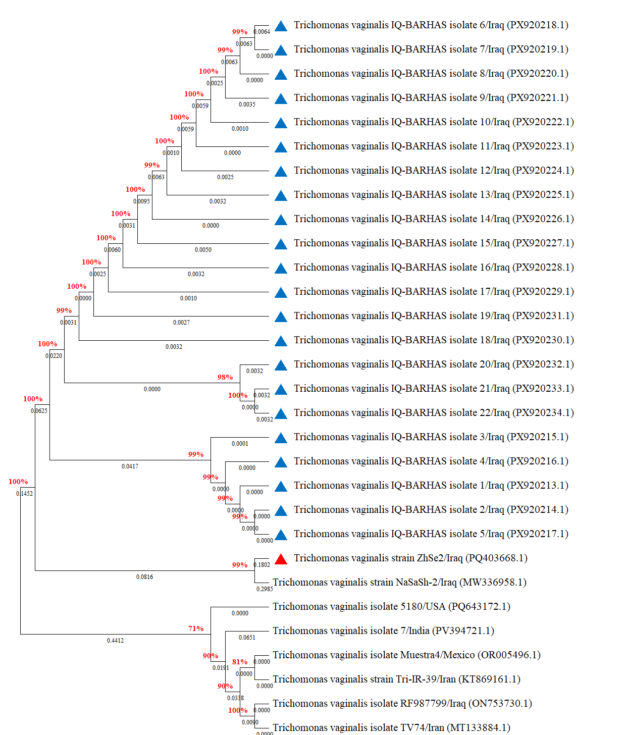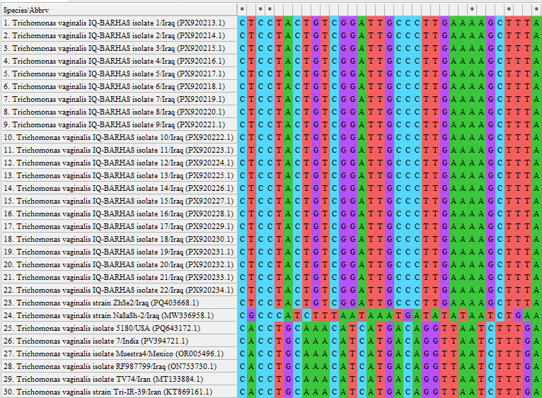 Molecular examination of 7.56% (22/291) of study women were positively infected by T. vaginalis using the conventional PCR and targeting the ITS1 region (Figure 1). The sequence data of all the positive T. vaginalis isolates (total=22) were entered in the NCBI-GenBank database, named (IQ-BARHAS 1, IQ-BARHAS 2, IQ-BARHAS 3, IQ-BARHAS 4, IQ-BARHAS 5, IQ-BARHAS 6, IQ-BARHAS 7, IQ-BARHAS 8, IQ-BARHAS 9, IQ-BARHAS 10, IQ-BARHAS 11, IQ-BARHAS 12, IQ-BARHAS 13, IQ-BARHAS 14, IQ-BARHAS 15, IQ-BARHAS 16, IQ-BARHAS 17, IQ-BARHAS 18, IQ-BARHAS 19, IQ-BARHAS 20, IQ-BARHAS 21, and IQ-BARHAS 22) and got respectively specific access numbers (PX920213.1, PX920214.1, PX920215.1, PX920216.1, PX920217.1, PX920218.1, PX920219.1, PX920220.1, PX920221.1, PX920222.1, PX920223.1, PX920224.1, PX920225.1, PX920226.1, PX920227.1, PX920228.1, PX920229.1, PX920230.1, PX920231.1, PX920232.1, PX920233.1, and PX920234.1). Phylogenetic analysis with the NCBI-BLAST T. vaginalis isolates / strains revealed that all study T. vaginalis isolates having a similarity (*) ranged from 98.10% to 99.46% and mutation / changes ranged from 0.003-0.02% with the NCBI-BLAST T. vaginalis Iraqi strain (ID: PQ403668.1), (Table 2, Figures 2-4).
