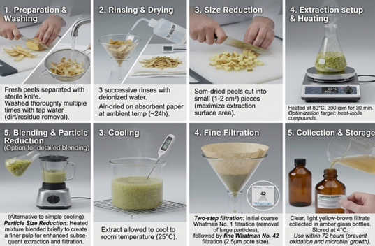 To prepare the extract, 20 grams of the dried pieces of potato peel were weighed accurately using an analytical balance and transferred to a 500 mL round-bottom Erlenmeyer flask which contained 200 mL of deionized water making the peel-to-water ratio 1:10 (w/v). The mixture was stirred with magnetic hotplate stirrer and heated at 80 o C with continuous stirring with 300 rpm of the flask of 30 minutes. This temperature and time were chosen on the basis of the preliminary optimization experiments targeted to achieve the maximum extraction of heat-labile bioactive compounds, in particular polyphenols and organic acids, and to avoid their excessive thermal damage. After the heating step, the extract was left to cool to a room temperature and then filtered using a set of filtration media: Coarse Whatman No. 1 filter paper was added at first to remove large particulate matter and then filtration through a fine Whatman No. 42 filter paper (2.5 μm pore size) was used to obtain a clear and light yellow-brown filtrate. The subsequent extract was kept in amber glass bottles at 4 o C and consumed within 72 hours of preparation in order to reduce phytochemical oxidation and microbial contamination [12].