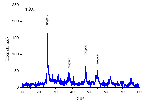 The X-ray diffraction (XRD) was used to determine the crystalline structure and phase composition of synthesized TiO2 NPs and the obtained diffractogram is depicted in Figure 2. The three clear, sharp peaks of the XRD pattern were of 25.16, 37.36, and 47.635 o at the (011), (004), and (020) crystal planes, respectively. These feature reflection peaks are well in accordance with the tetragonal anatase form of TiO2 as verified by comparison with the Crystallography Open Database (COD) reference entry No. 96-900-8217. The fact that no other diffraction peaks appeared as a result of rutile or brookite or other polymorphic phase is a clear indication that phase-pure anatase TiO2 nanoparticles have been formed successfully [14].