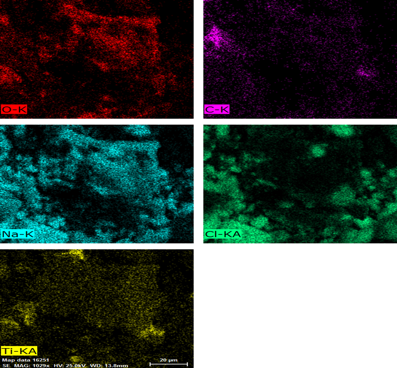 The EDX elemental mapping (Figure 6) was used to give spatially resolved compositional information on the assembly of the nanoparticles. The maps show that both Ti and O are distributed homogenously and uniformly across the examined region and no elemental segregation, phase separation, or clusters of impurities can be observed. Such a homogeneity of the space is an excellent sign of the chemical homogeneity of the produced TiO2 NPs and also confirms the conclusion of the success of phase-pure nanoparticle synthesis..