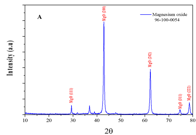X-ray diffraction (XRD) on a Shimadzu XRD-6100 diffractometer with Cu K alpha radiation (1.5406 A) at 1080o was used to determine the crystalline structure and phase purity of the MgO NPs synthesized and the average crystallite size estimated using the Scherrer equation. The field emission scanning electron microscopy (FESEM, TESCAN MIRA3) was used to examine the surface morphology and the size distribution of particles, whereas the elemental composition was measured simultaneously by energy-dispersive X-ray spectroscopy (EDX). To determine the functional groups and bonding properties of the synthetic nanoparticles on the surface, Fourier-transform infrared spectroscopy (FTIR) was conducted on a Bruker Vertex 70 spectrometer at the spectrum of 4004000 cm -1 with the use of KBr pellets.