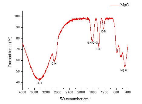 The Fourier-transform infrared spectroscopy was used to determine the functional groups that were characteristic of the MgO nanoparticles synthesized as well as determine the contribution of the phytochemical constituents present in the eggplant extract to the bio-mediated synthesis process. The FTIR spectrum of the calcined MgO NPs had a strong absorption band in the low-wavenumber region at around 400 and 600 cm -1 , and this is due to the characteristic stretch vibration mode of Mg-O bond, which forms the major diagnostic signature of magnesium oxide and it is a sure confirmation that the inorganic MgO lattice structure has been formed [14].