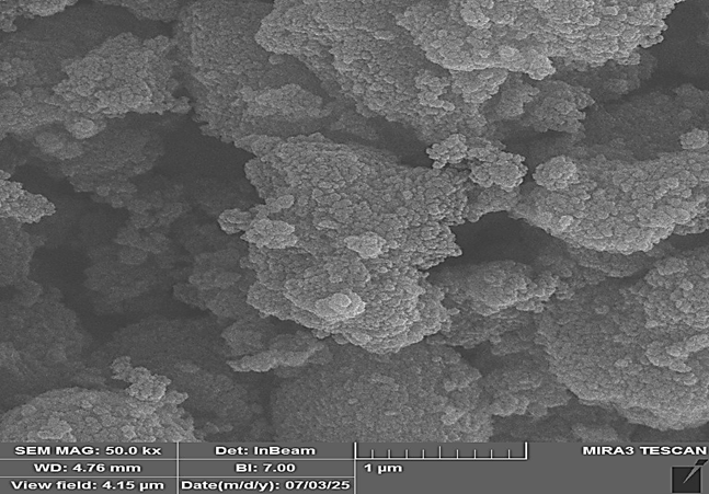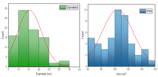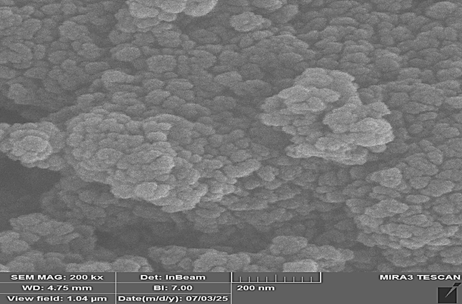 Using the methods of analysis of quantitative images, the analysis of the FESEM micrographs was performed, and measurements of 85 separate nanoparticles were conducted using a Gaussian distribution. The results of the analysis were a mean particle diameter of 23.14 to 12.93 nm . Minimum and maximum measured sizes were 8.192 and 68.92nm, respectively and median position was 19.07nm, which show a right-skewed size distribution typical of bottom-up synthesised nanomaterials when Ostwald ripening might cause a fraction of the total material to be larger. The size of the particle as calculated using FESEM analysis (23.14 nm) is relatively larger than the size of crystallite as calculated using XRD/Scherrer (18.56 nm ), a phenomenon that is frequently seen in the characterization of nanomaterials, and is due to an individual FESEM-measured particle potentially being a polycrystalline aggregate of multiple coherently diffracting crystalline domains. Also, the Scherrer equation examines the volume weighted mean crystallite dimension, and FESEM examines projected two-dimensional particle diameters intrinsically giving slightly larger values. Table 2 summarizes the data.