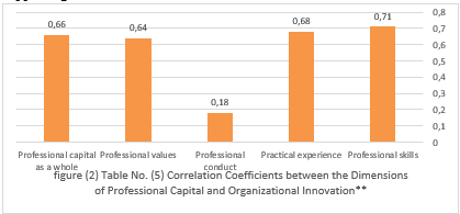 A detailed study of data analysis about correlation and regression showed that not only did the other two productive dimensions, of professional capital both show significant correlations between them and creativity changes, but inputs professional behaviour also This was interesting--since when you switched to a multiple linear regression The dimensions of professional capital showed strong correlations with organizational innovation, most of which were statistically significant in the multiple linear regression results, with the exception of the professional behaviors dimension, which did not show significance in either test. The professional skills dimension had the largest correlation (0.71**) and highest effect value (B = 0.312, Sig. = 0.001), showing that having advanced professional skills directly contributes to improving organizational innovation. This is in keeping with the nature of banking work, which depends on professional precision, dealing with electronic systems and handling complex operations--making professional skills one of the most important driving forces behind innovation in banking.