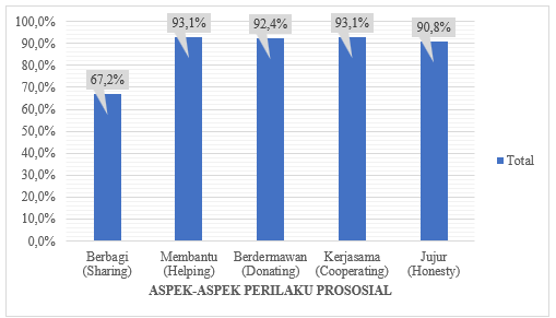 Diagram 1 menujukkan gambaran aspek-aspek perilaku prososial pada siswa SMK Sepuluh Nopember Sidoarjo. Diagram tersebut memperlihatkan apabila siswa dominan pada aspek membantu (helping) dan kerjasama (cooperating) yang sama-sama mendapatkan nilai 93,1%. Fitri et al. [21] mendukung hasil penelitian ini. Fitri et al. menyatakan apabila indikator membantu pada peserta didik berada dalam kategori yang baik. Artinya peserta didik mampu untuk memberikan ketersediaannya dalam membantu atau memberikan pertolongan dan dukungan pada orang lain yang sedang mengalami kesulitan dengan baik. Selain itu penelitian ini juga mengungkap jika aspek kerjasama pada perserta didik berada dalam kategori cukup baik karena mereka bersedia untuk bekerjasama untuk menerima pendapat atau masukan dari orang lain. Menurut Yunita & Yusfarani siswa masih belum mempunyai rasa ketersediaan dalam berbagi dengan siswa lain. Pernyataan tersebut menunjukkan jika perilaku sosial pada aspek berbagi (sharing) siswa lemah atau rendah. Siswa kurang menekankan perhatian pada norma-norma prososial yang akhirnya bisa menimbulkan perilaku antisosial atau tidak mempunyai peduli dengan keadaan lingkungan. Seperti pada hasil penelitian ini yang memperlihatkan dalam aspek berbagi (sharing) berada dalam kategori paling rendah dengan nilai sebesar 67,2%.